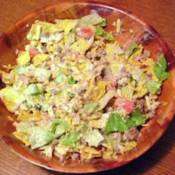 Layer all ingredients starting with lettuce and ending with cheddar cheese. Sprinkle each layer with taco seasoning. Chill. Before serving add slightly crushed taco chips and toss with the dressing.