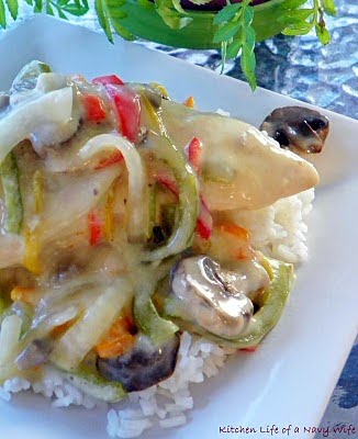 In a large skillet, brown chicken in oil on both sides. Transfer to a 5-qt. slow cooker. Top with mushrooms, onion and peppers. Combine the soups; pour over vegetables. Cover and cook on low for 4-5 hours or until a meat thermometer reads 170°. Serve with rice.