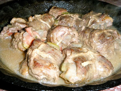 Move rolls to serving dish and keep warm. Add enough water to casserole to make 2 1/2 cups liquid. Blend in flour. Bring to boil, stirring, and simmer about 3 minutes. Adjust seasoning. Add cream to gravy,then pour over meat in serving dish. Serve with noodles or plain boiled potatoes.