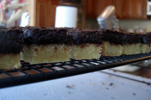 In a heavy saucepan combine, butter, brown sugar and chocolate. Melt over medium heat stirring occasionally till smooth.Remove from heat, let cool a few minutes. Whisk in lightly beaten eggs and vailla. Add your salt. Then add flour and cocoa. Nuts if using. Mix well.Pour into prebaked baked butter cookie crust. Spread brownie batter evenly until smooth Bake until set, 20 minutes or so at 375. Cool and cut into squares.