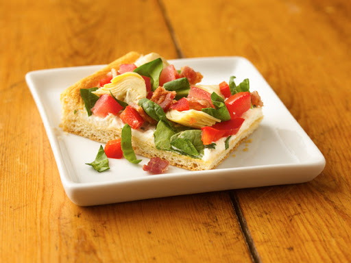 Easy artichoke bacon appetizer is quick to make when you start with a roll of refrigerated crescent rolls. You can prepare the crust ahead of time, and top with the artichoke mixture 15 minutes before serving.