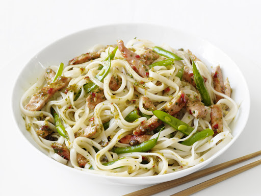 Place the pork in the freezer about 10 minutes to make it easier to slice. Soak the noodles in very hot water until just tender, about 10 minutes; drain. Snip the noodles with scissors into shorter lengths. Cut the frozen pork crosswise into 1/4-inch-wide strips.