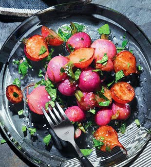 Brief high-heat roasting mellows a radish's peppery flavor and turns it into a whole new root vegetable. Using the green radish tops adds color and amps up the radish flavor. Be sure to rinse the green tops thoroughly before using them. This would be a great side dish for roasted pork loin or leg of lamb.