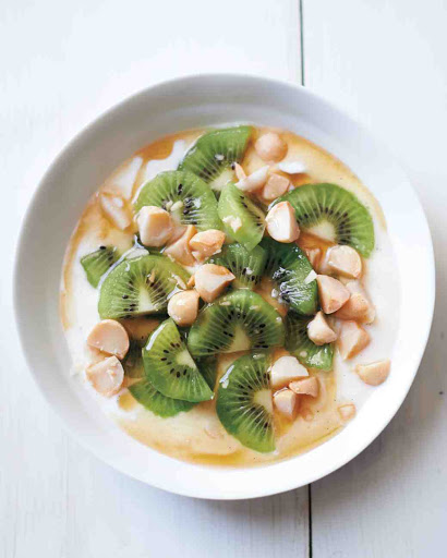 Place yogurt in a bowl. Add kiwifruit and macadamia nuts. Drizzle with maple syrup and serve.