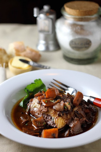 A few minutes before serving, put the chicken pieces back into the sauce to re-heat. Serve each chicken thigh topped with a ladle of sauce and garnished with chopped parsley leaves or a whole parsley sprig.