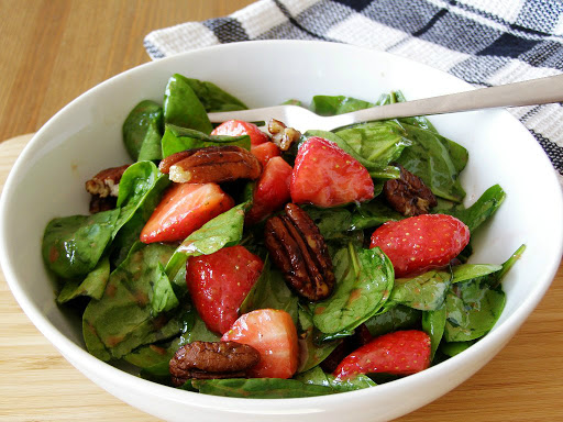 Toss spinach with sliced strawberries, pecans, and cheese, if using.