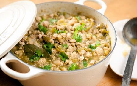 Heat 1/2 tablespoon of the oil in a large pot over medium high heat. Add turkey and cook, stirring often, until browned. Transfer to a bowl and return pot to heat. Add remaining 1 tablespoon oil, bell pepper and onion and cook until softened and golden brown. Return turkey to pot and add coriander, cumin, oregano and salt. Stir well to combine. Add bay leaf, tomatillos, chiles, jalapeños and broth, reduce heat and simmer, uncovered, 45 to 50 minutes. Gently stir in beans and cook for 30 minutes more. Stir in cilantro, ladle chili into bowls and garnish with cheese and sour cream, if you like.