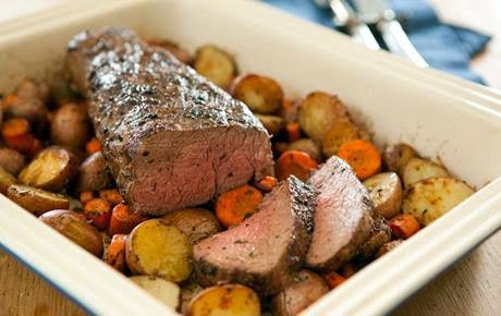 Toss potatoes and carrots and continue to roast until tender and golden brown, about 10 minutes more. Transfer to a serving bowl. Cut beef into slices and serve with pan drippings drizzled over the top.