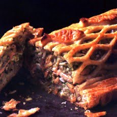 Next, spoon the salmon mixture on top of the rice, building it up as high as possible and pressing and moulding it with your hands – what you're aiming for is a loaf shape of mixture. Then lightly mould the rest of the rice mixture on top of the salmon and brush the 1 inch (2.5 cm) border all round with beaten egg. Next, take the lattice cutter and run it along the centre of the other piece of pastry, leaving an even margin of about 1 inch (2.5 cm) all round. Brush the surface of the pastry with melted butter, then very carefully lift this and cover the salmon mixture with it. The idea here is not to let the lattice open too much as you lift it, because it will open naturally as it goes over the filling. Press the edges together all round to seal, then trim the pastry so that you're left with a ¾ inch (2 cm) border. Now using the back edge of a knife, knock up the edges of the pastry, then crimp it all along using your thumb and the back of the knife, pulling the knife towards the filling each time as you go round. Alternatively, just fork it all around.
