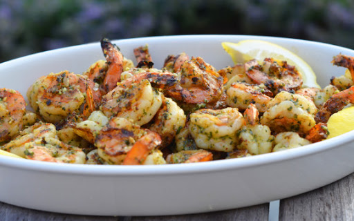 Preheat the grill to medium-high heat. Lightly dip a wad of paper towels in vegetable oil and, using tongs, carefully rub over the grates several times until glossy and coated. Place the shrimp on the grill and cook until plump and slightly charred, a few minutes per side. Transfer the cooked shrimp to the bowl with the reserved pesto and toss to coat evenly. Serve immediately.