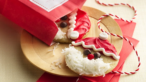 Frost cooled cookies with red and white frosting. Use small amount of frosting to attach chocolate chips for eyes and cinnamon candy for nose. Gently press coconut into white frosting for beard. Press marshmallow into red frosting for tassel on cap. Let stand until frosting is set. Store between sheets of waxed paper in tightly covered container.