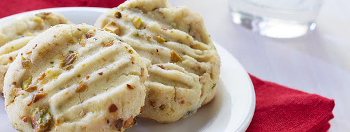 Combine flour and corn starch in a separate medium bowl. Add to butter mixture on low speed until well combined. Beat in chopping pistachio nuts.