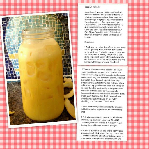 5.Put on a lid on the jar and shake like you are a professional drink mixer. Un cap... taste and ... OWN IT!!!!! Quite a bit of stevia is required to combat the strong flavors of lemon pith and turmeric and to balance out the Celtic Sea Salt. If your Canary has too biting a flavor, add a little more stevia and/or vanilla.