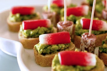 So I've been on an avocado kick, and because the season of pink radishes is in full swing, I've been hung up on them, too. The classic way to enjoy pink radishes is to eat them with bread, butter, and salt, so I had this idea for a canapé: substitute avocado for the butter -- what is avocado if not green butter? -- and smoked salt for the ordinary salt.