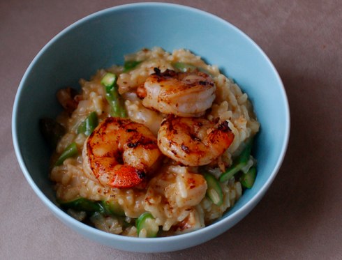5. Ok! Back to the risotto! I hope you have been stirring occasionally! Now add in your chopped shrimp, and your steamed asparagus – take a little taste – and season with some salt and pepper if it needs it. (The flavors from the shrimp should usually do it, but it might need just a tad more. Pastor Ryan adds in some green onions here… but I erm… don’t like them very much, so I omit them. I’m sure they would be good if you enjoy them though!