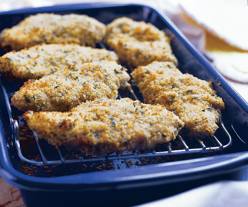 To coat and cook the chicken: Heat the oven to 450°F and butter a baking sheet or rack. Take a breast from the marinade with one hand--this is now your "wet" hand. Don't wipe off the marinade. Lay the chicken on the crumbs. Scoop and pat the crumbs over the breast using your other hand (your "dry" hand), patting until both sides are thoroughly coated. Put the breast on a buttered baking sheet or rack and repeat with the remaining breasts. Roast the chicken until it's crisp, browned, and cooked through, 25 to 30 minutes. Check after 15 minutes. If the chicken is getting too brown, reduce the heat to 400° and add 5 minutes to the total cooking time.