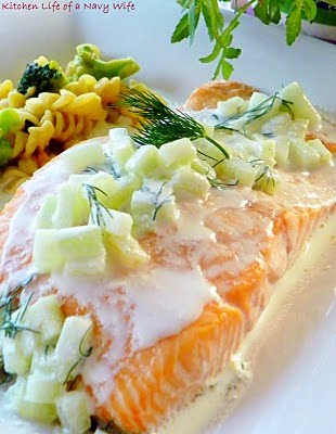Meanwhile, in a small saucepan mix milk and cream cheese; cook and stir on medium until cream cheese is completely melted and mixture is well blended. Stir in cucumbers and dill.