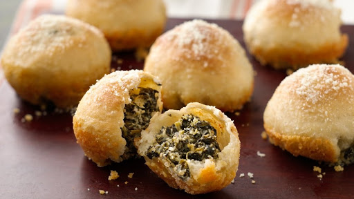 Remove dough from can; cut into 12 equal slices. Press each to form 3-inch round. Place 1 spinach ball in center of each dough round. Carefully wrap dough around ball; pinch edges to seal completely. Place seam side down in muffin cups.