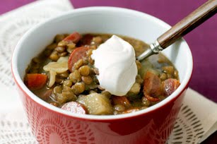 consejos de las cocinas kraftALTERNATIVAPrepárala con salchichas reducidas en grasa y calorías OSCAR MAYER Light Wieners y crema agria reducida en grasa BREAKSTONE'S Reduced Fat Sour Cream o la de KNUDSEN Light.CONOCIMIENTOS DE COCINAAntes de usar las lentejas, enjuágalas bien en un colador. Deshazte de las marchitas y de la arenilla. A diferencia de los frijoles, no es necesario remojar las lentejas antes de cocinarlas. HAZLO ANTESLa sopa se puede preparar antes. Déjala enfriar, guárdala en un envase hermético y congélala hasta por 1 mes. Cuando la vayas a servir, transfiiere el bloque helado a una olla grande y tápala. Cocínala a fuego bajo hasta que se descongele. Hazla hervir a fuego medio; luego, caliéntala manteniendo un hervor suave durante 10 min. o hasta que se caliente del todo; recuerda revolver de vez en cuando.