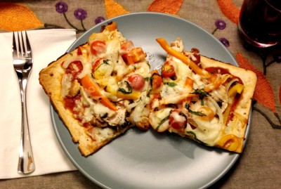 Spread a thin layer of marinara across the flatbread. Add a few dollops of pesto and blend. Top with chicken and canadian bacon and then as many veggies as will fit. Sprinkle a thin layer of mozzarella on top. Finish with a sprinkle of parmesan cheese and fresh basil. Bake flatbreads for 12 to 15 minutes at 400 degrees.