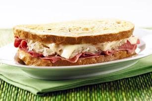 COVER each of 4 bread slices with layers of corned beef, sauerkraut, cheese and dressing; top with second bread slice.