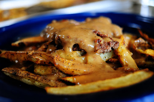 To serve, place an ample amount of fries on the plate. Place a hamburger on top of the fries and cover it all amply in gravy. Enjoy!