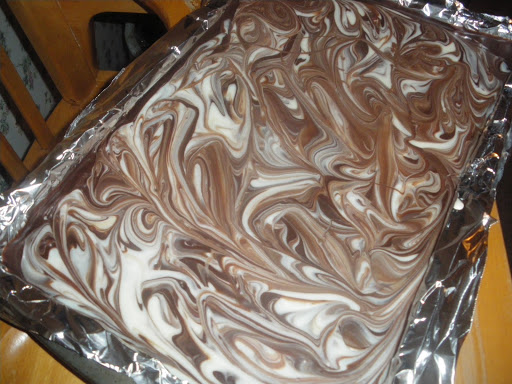 Place the 1/3 cup semisweet chocolate chips into a heavy-duty resealable plastic bag and heat in the microwave on high power for about 45 seconds, until melted. Knead the chips until smooth. Cut a tiny corner from the bag and drizzle over the chocolate in the pan. Swirl with a knife. Chill for about 1 hour, or until set. Lift the foil from the pan then break the bark into pieces and serve.