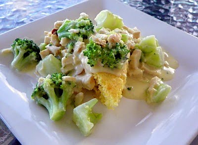 Cut warm corn bread into wedges; top with chicken mixture. Sprinkle with cheese.