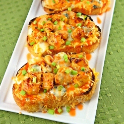 5. Broil toast 2-4 minutes, watching closely and rotating the pan as needed. Remove and top with another drizzle of buffalo wing sauce and green onions.
