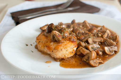 Heat the remaining 1/2 tablespoon butter (no need to wash the pan). Add in the onion and garlic and cook until fragrant. Add in the mushrooms and cook until the mushrooms have reduced. Add in the chicken stock and cook until the liquid has reduced by half. Season with salt, black pepper and herbs (if using). Scoop the sauce over the chicken and serve.