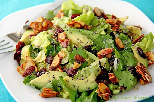 Cranberry-Avocado Salad with Candied Spiced Almonds and Sweet White Balsamic Vinaigrette