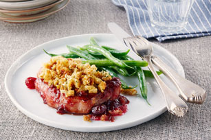SPREAD cranberry sauce onto bottom of 13x9-inch baking dish sprayed with cooking spray; top with chops and stuffing. Cover.