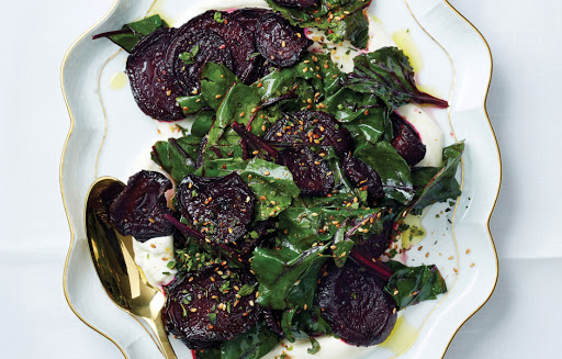 - 4 bunches of beets with tops or 2 lb. medium beets plus 1/2 bunch Swiss chard, ribs and stems removed, leaves torn into large pieces