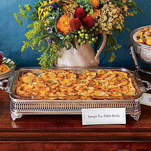3. Layer one-third of Yukon gold potatoes in a well-greased (with butter) 9- x 13-inch baking dish; top with one-third of sweet potatoes. Spoon one-third of cream mixture over potatoes, and sprinkle with 1/2 cup Gruyère cheese. Repeat layers twice, and top with Parmesan cheese. Cut remaining 1 Tbsp. butter into small pieces, and dot over top. Cover with foil.