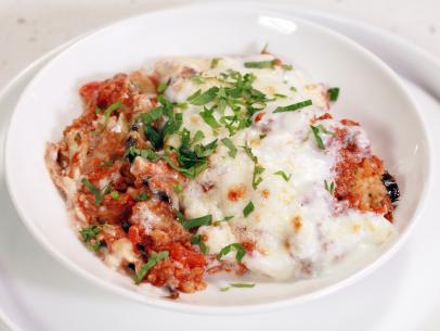 Make two layers of eggplant and lamb mixture in a medium casserole dish. Pour the sauce over the top and sprinkle with the remaining cheese. Bake until browned and bubbling, 30 to 40 minutes.