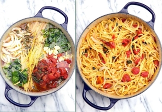 Place pasta, tomatoes, onion, garlic, basil, in a large stock pot. Pour in vegetable broth. Sprinkle on top the pepper flakes and oregano. Drizzle top with oil.