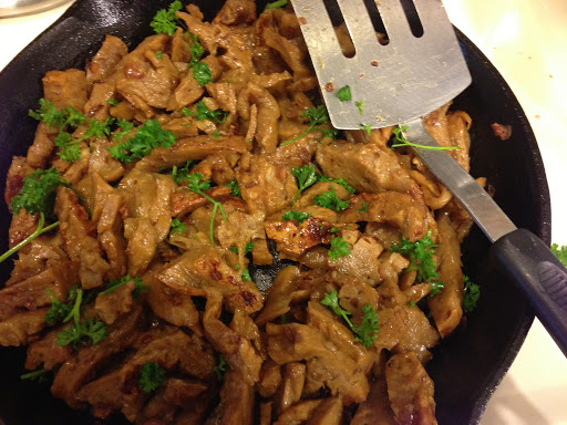 Slice thinly. ... again, don't try to be perfect. Then saute in some olive oil. When it starts to brown add another quarter cup of bulgogi marinade and saute until the sauce starts to thicken and stick to the slices. Use the metal spatula to slice the meat even thinner and into irregular pieces. See picture.