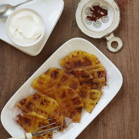 3. Place the slices of pineapple on the waffle iron grid and close the lid. For fresh pineapple, cook for 4 minutes before checking. For canned pineapple, cook for 1 minute before checking. When the pineapple is starting to show golden brown waffle indentations, remove it and place it on a platter.