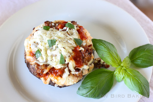 Let the mushrooms cool until they can be handled. Drain any excess moisture from the caps. In a small bowl, mix the ricotta cheese, half a lightly beaten egg, basil, rosemary, 1/4 teaspoon of kosher salt, and a grind or two of pepper. Spoon 1-2 tablespoons of pasta sauce into each mushroom cap and top with a smashed garlic clove and a generous heap of the ricotta mixture. Press half of the Italian sausage into the ricotta mixture on each mushroom and top with another tablespoon or two of pasta sauce, a generous sprinkle of Mozzarella cheese, and another small grind of pepper. Place the mushrooms back into the oven until the ricotta mixture is set and the cheese is melted and bubbly, about 10 minutes. Serve immediately.