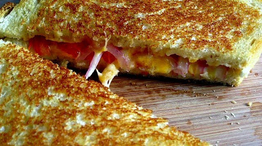 Sauté onion until caramelized. Preheat a panini press or grill pan. Arrange the bread slices in pairs and very lightly butter 1 side of each slice. Place 4 slices of bread buttered side down on grill and mound half of the cheeses on each slices. Top with the onions, and tomatoes, the remaining cheese, and the remaining bread, buttered side up. Grill until the bread is toasted and the cheese is melted. Cut the sandwiches in half and serve