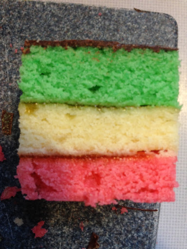 7.Line a large shallow baking pan with wax paper and slide green layer into it. Heat Preserves;strain. Spread half of the strained preserves over green layer. Top with yellow layer(plain). Spread remaining preserves on yellow layer. Top with red layer