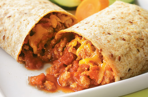 Spoon chili onto centre of each tortilla; sprinkle with Cheddar. Fold in bottom and sides; roll up. Place, seam side down, on greased baking sheet.