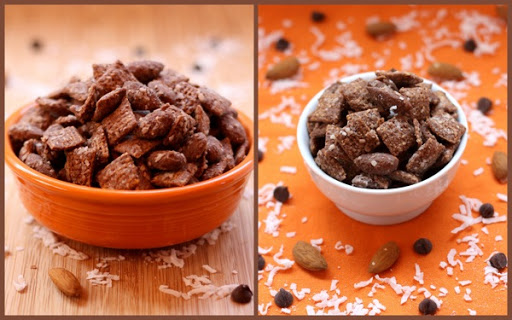 Pour the chocolate mixture over the Chex and almonds, and stir until the cereal is completely coated.