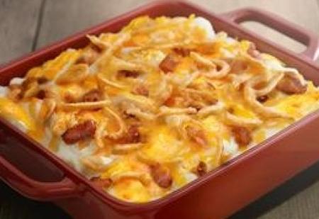 Preheat the oven to 350. Layer half of the potatoes in an 8-inch square baking dish, sprinkle with half of the bacon, 1 cup cheese and 1 cup French fried onions. Top with remaining potatoes.