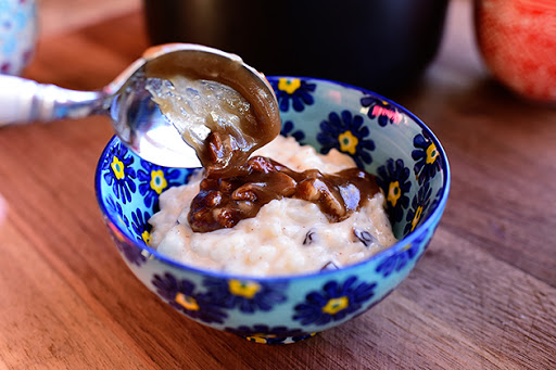 Top each portion of rice pudding with some of the Caramel-Pecan Sauce.