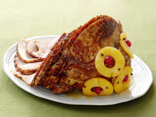 Decoratively arrange the pineapple slices on top of the ham, securing them with whole cloves, if using, or toothpicks. Place a cherry in the center of each pineapple ring and secure with a clove or toothpick.