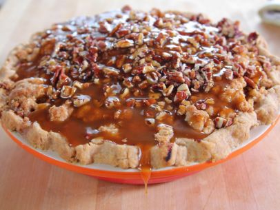 Remove the pie from the oven and pour 1/2 jar (or more, if you're feeling dangerous and naughty) of caramel topping over the top. Allow to cool slightly before serving--or don't if you can't wait!