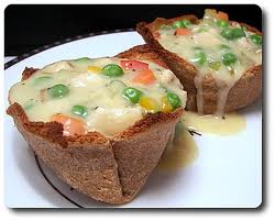 Cut crusts off bread. Using rolling pin, roll each slice to 1/4-inch (5 mm) thickness. Fit each into lightly greased 6-oz (175 mL) custard cup or jumbo muffin pan. Bake in centre of 375°F (190°C) oven until golden brown, about 8 minutes.