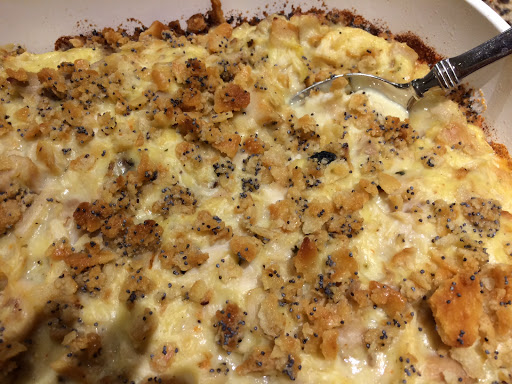 Mix crumbs, butter and poppy seeds. Reserve 1 cup. Press remainder into 9x12-inch baking dish. Mix soup, sour cream and chicken. Pour over crumb mixture. Sprinkle with reserved crumbs. Bake at 350 degrees for 30-35 minutes.