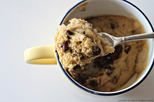 Start by melting your butter in the microwave. Add sugars, vanilla and salt. Stir to combine. Separate your egg and add the yolk only to your cup. Stir to combine. Add flour, then stir again. Add the chocolate chips, and give a final stir. Cook in microwave 40-60 seconds, start checking for doneness at 40 seconds. Mine takes 50 seconds.